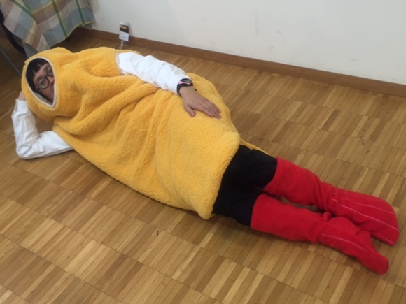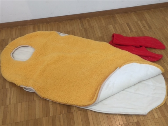 今回個人的に一番衝撃的だった商品が、このエビフライの寝袋です。